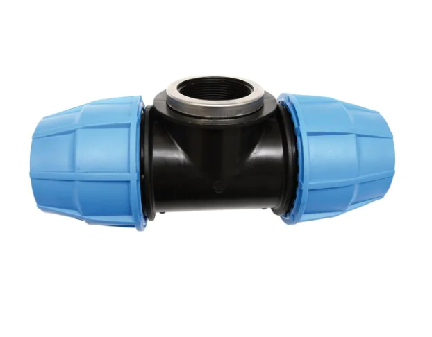 Retrouvez le raccord polypropylène à serrage extérieur Série 1009, modèle en T, taraudé femelle au centre pour tube polyéthylène à haute densité, certifié ACS, bague de serrage en nylon pour réseaux de distribution et d’adduction d’eau