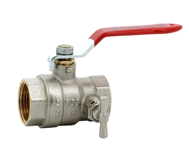 La vanne à sphère 585 à purge Sferaco Laiton titré CW617N Bâtiment+, ACS 4MS, pour utilisations en chauffage sanitaire, eau potable, climatisation, arrosage etirrigation. Passage intégral et portée plate large, poignée acier plate rouge