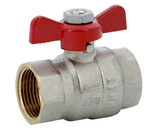La vanne à sphère 586 Sferaco Laiton titré CW617N série Bâtiment+80S, ACS 4MS, pour utilisations en chauffage sanitaire, eau potable, climatisation, arrosage et irrigation. Passage intégral et portée plate large, manette papillon rouge